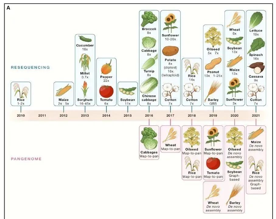 有了重要基因功能信息、基因组学工具和基因编辑技术,如今从头驯化(将野生植物从头改造成栽培植物)或重驯化(选择已有作物的野生种重新改造)已经成为可能,遗传改良的效率和潜力也大大提升,近年来已有多个例证。