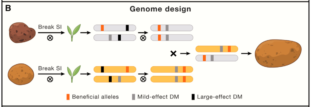 在土豆中,黄三文团队通过基因组设计育种与基因编辑技术相结合,首次培育出了高纯合的二倍体马铃薯自交系和杂交马铃薯品系“优薯1号”,实现了用二倍体育种替代四倍体育种、用杂交种子繁殖替代薯块繁殖的梦想。